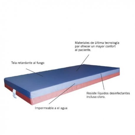 Fabricado de poliuretano de alta densidad. Cubierta lavable, resiste todo tipo de líquidos hospitalarios. Impermeable al agua. El colchón por defecto va sin secciones. Peso max: 200kg.